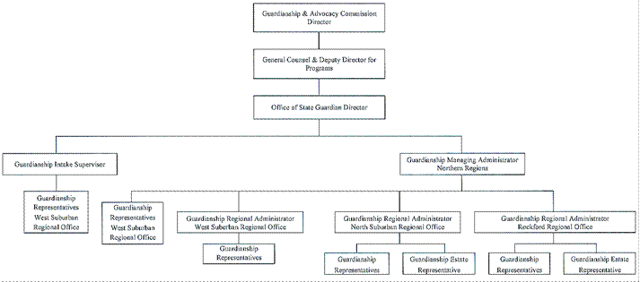 SUBTITLE E: MISCELLANEOUS STATE AGENCIES CHAPTER XVI: GUARDIANSHIP AND ADVOCACY COMMISSION PART 1875 PUBLIC INFORMATION, RULEMAKING AND ORGANIZATION SECTION 1875.APPENDIX A ORGANIZATIONAL CHART: OFFICE OF STATE GUARDIAN NORTHERN REGIONS Section 1875.APPENDIX A Organizational Chart: Office of State Guardian Northern Regions