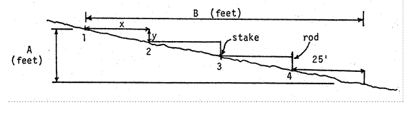 1. Obtain a 40 foot length of string or wire with a 25 foot section marked off (if you use nylon, measure the 25 feet with a steel tape because nylon stretches when pulled taut); carpenter's line level from a hardware store; a stake; a rod about 8 feet long (an 8 ft. 2 x 4 works well); a tape measure; a notebook and an assistant.