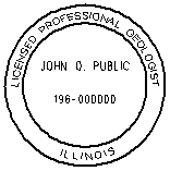 a) In accordance with Section 60 of the Act, each licensee shall obtain, at his/her own expense, a seal or rubber stamp, 1¾ inches in diameter. The seal or stamp shall consist of concentric circles between which shall appear in capital letters "ILLINOIS" in the lower portion of the seal and "LICENSED PROFESSIONAL GEOLOGIST" in the upper portion of the seal. Within the inner circle of the seal shall appear the name of the licensee and the individual's license number.